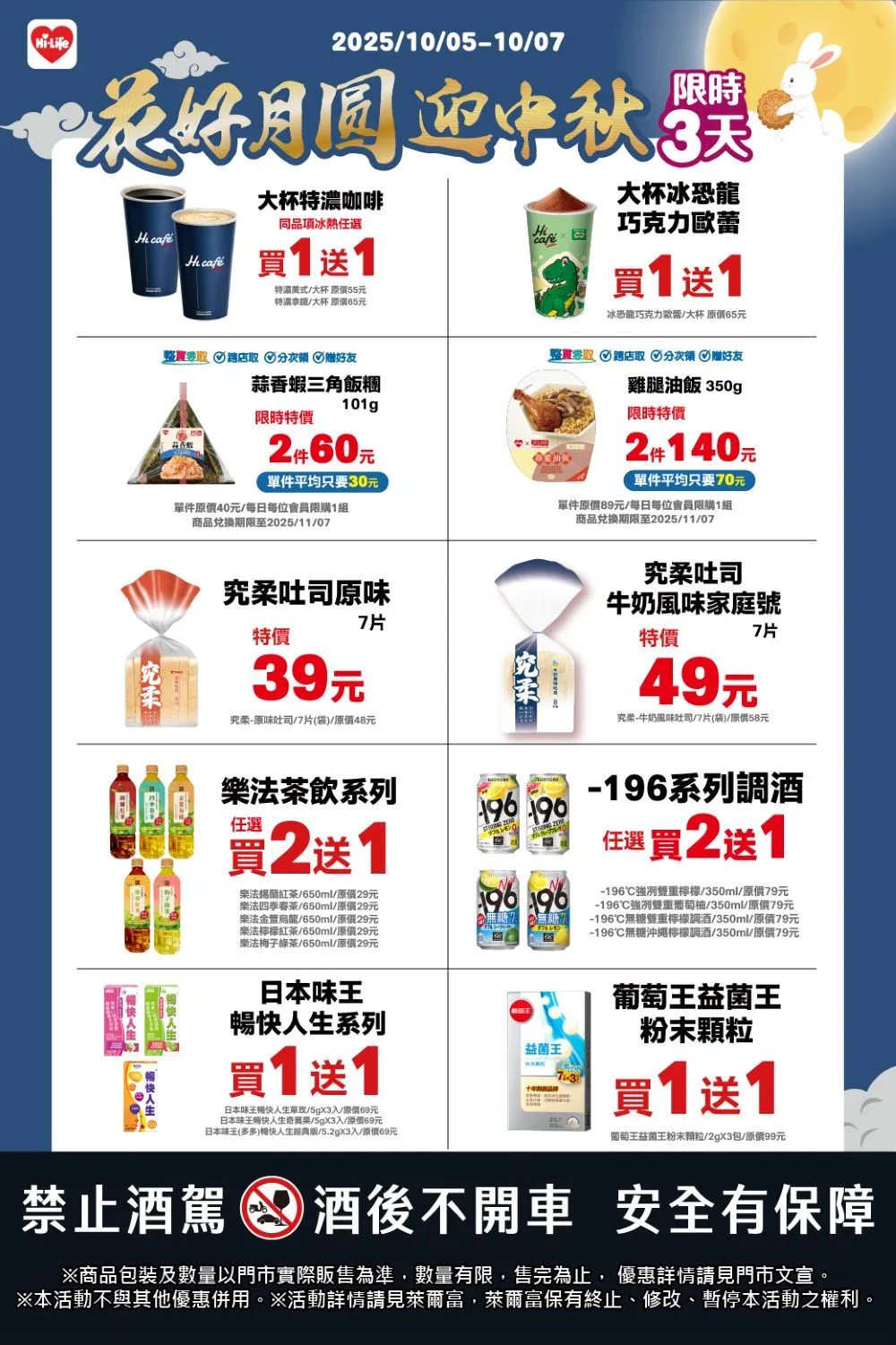 中秋佳節將至,月圓人團圓Hi-Life 特別推出 「花好月圓迎中秋」限時三天優惠活動(2025/10/05–10/07),讓民眾在節慶期間享受美味與實惠價格,共度溫馨佳節。