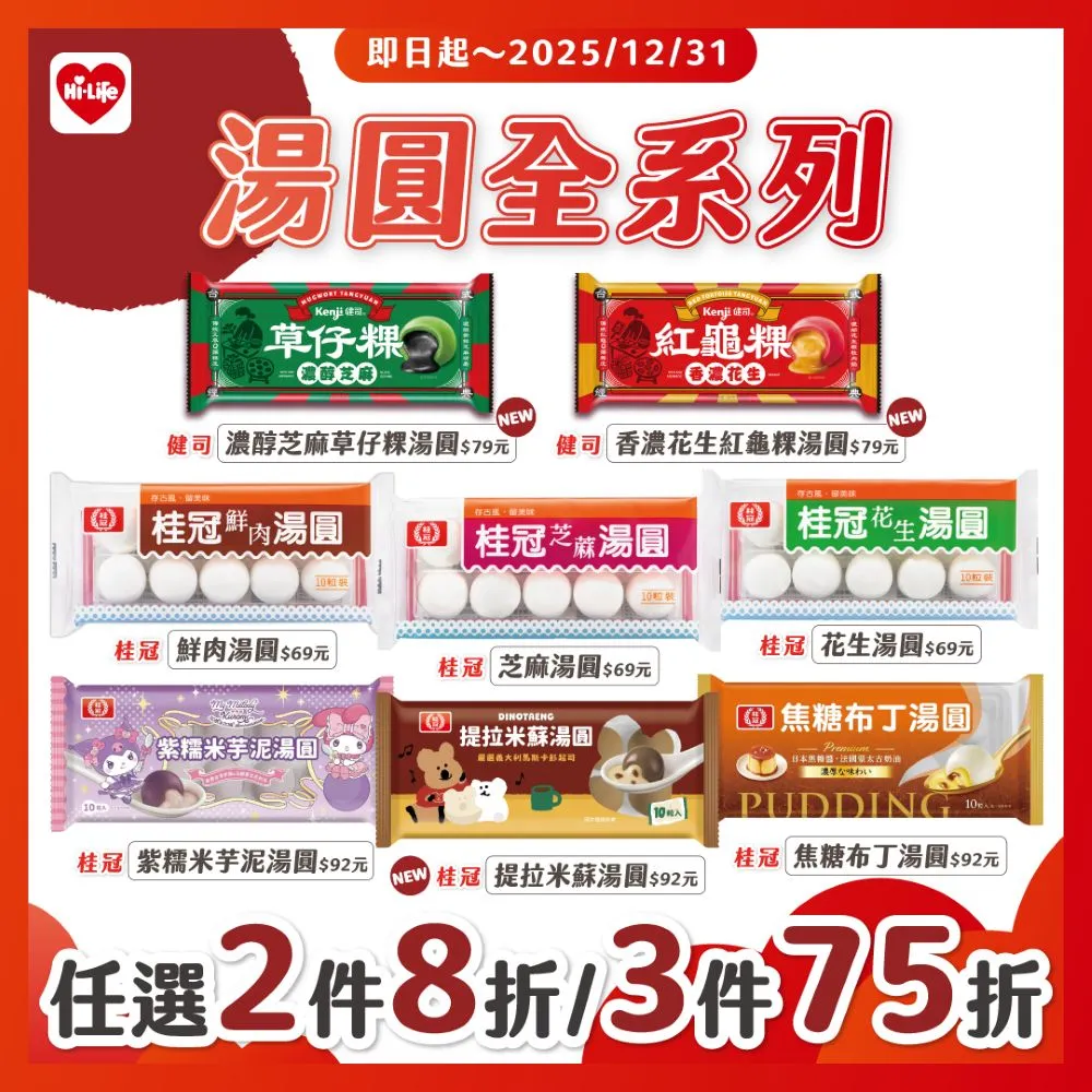 萊爾富即日起至12月31日推出全系列湯圓優惠,任選2件8折、3件75折,提供多元口味選擇,滿足不同族群需求。