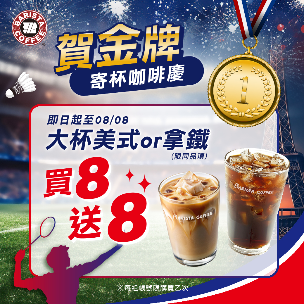 狂賀!奧運羽球男子雙人組為台灣摘下第一面金牌,麟洋配奧運金牌二連霸!即日起8/5(一)至8/8(四)連續四天西雅圖極品咖啡門市寄杯美式咖啡/拿鐵(限同品項)享【買8送8】優惠!西雅圖與大家一起為每一位台灣健兒加油!