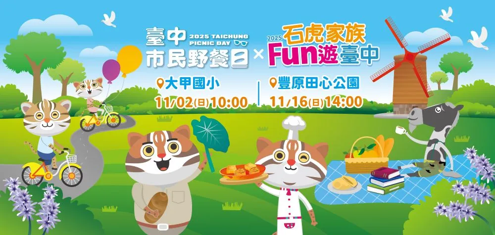 2025台中市民野餐日將於11月16日在豐原田心公園舉辦,「石虎家族與歐米馬」5隻吉祥物全員集體出動,還有YOYO家族人氣明星KIWI姐姐、柳丁哥哥及蔓越莓姐姐帶小朋友盡情唱跳放電,現場更設有親子館體驗、互動遊戲攤位、文創市集。