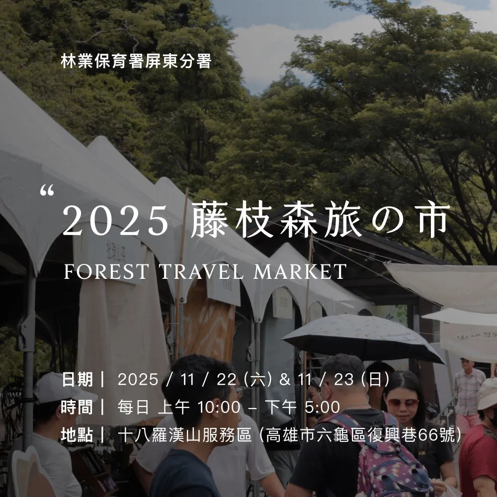 「森旅の市」將於11月22、11月23日在十八羅漢山服務區舉行,讓民眾體驗山茶文化與地方特色。市集包含在地小農品牌、特色農特產品與工藝創作,並以推廣寶山部落原生山茶為核心,以「森旅」為主軸,展現茶與族群文化。