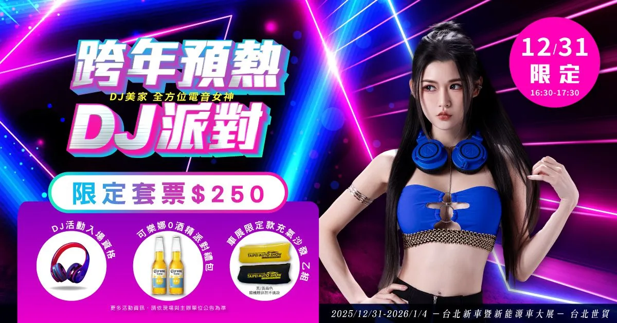 2026台北新車暨新能源車大展將於12月31日推出一日限定「跨年 DJ 派對」限定活動,打造全台唯一看車展、拿好禮、嗨跨年的盛大跨年新體驗!今年主辦單位首度與電音女神合作「DJ美家」,限量推出的「跨年 DJ 派對限定活動票」,只要250元(不包含車展入場票)即可擁有跨年DJ派對活動參與資格,並可獲得一份指定活動限定禮品。