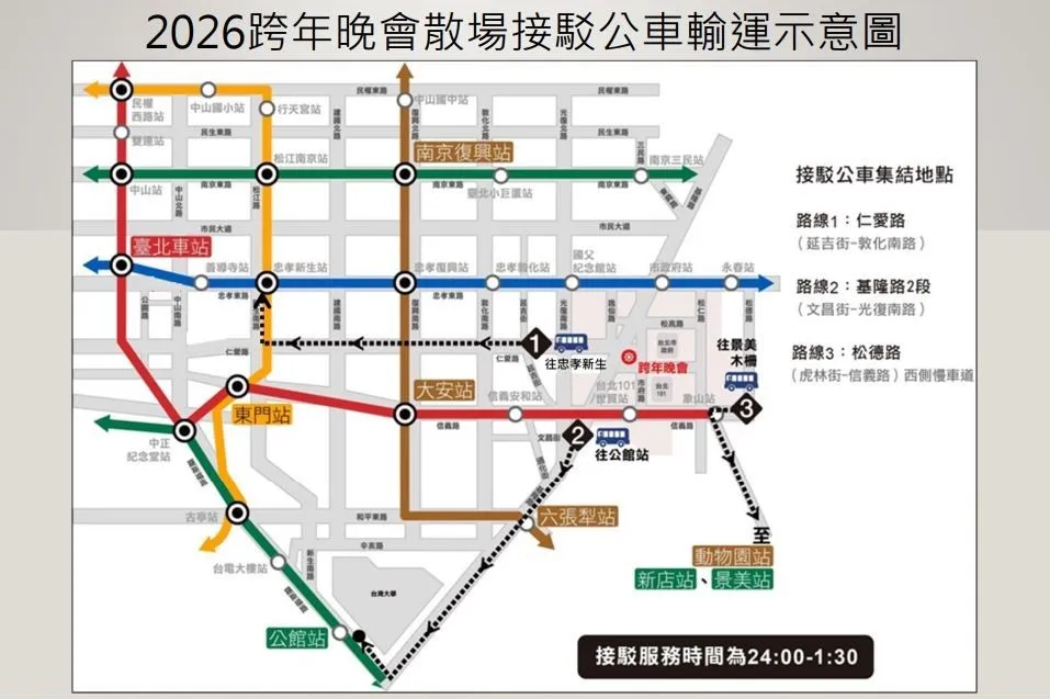 臺北市公共運輸處配合12月31日「2026臺北最HIGH新年城」跨年活動散場人潮疏運,特別規劃3線散場接駁公車。此外,配合跨年活動預計將有37線信義區周邊公車配合延後收班,以因應參與跨年民眾輸運服務需要。