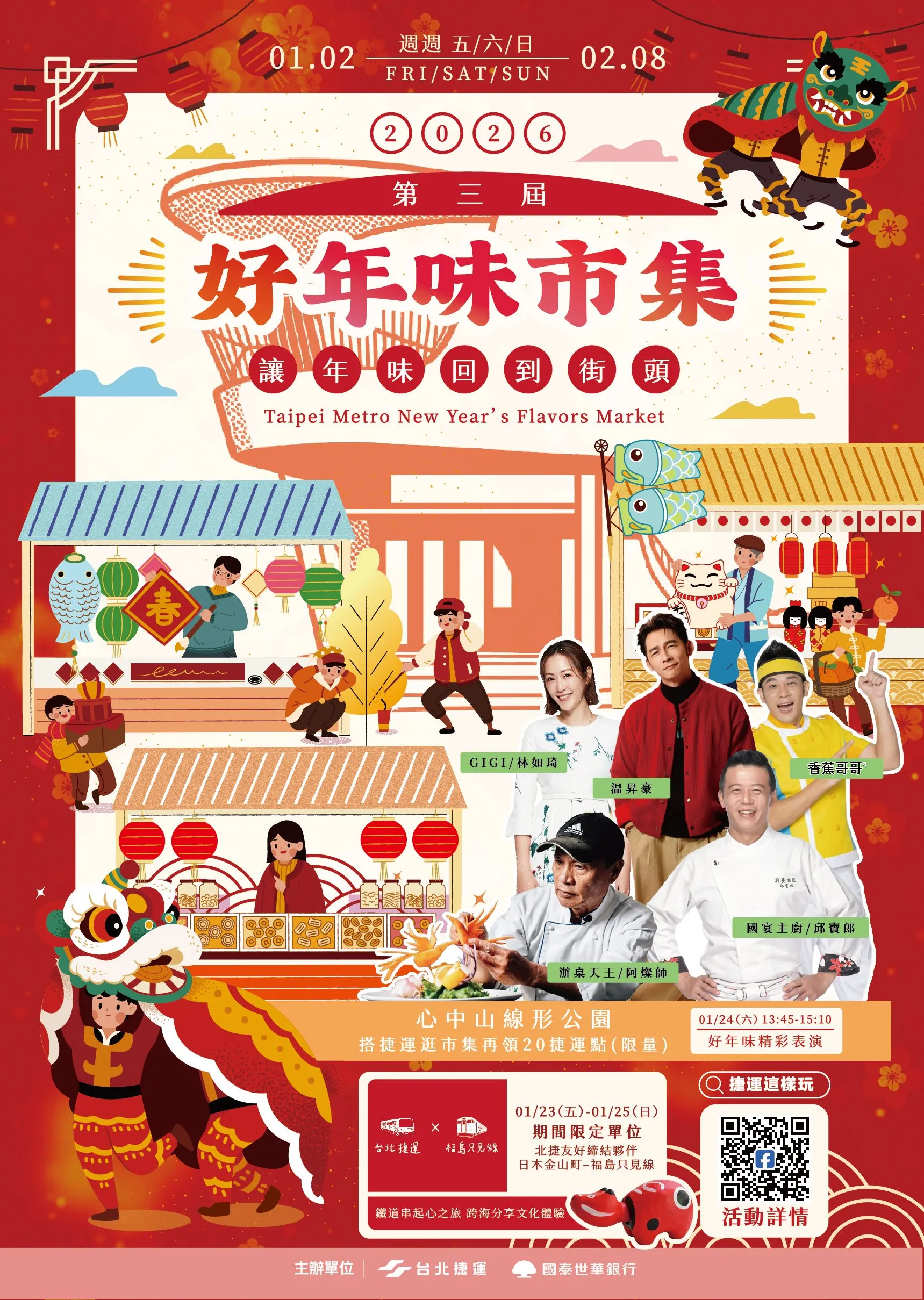 臺北捷運公司攜手農漁畜花卉四大產銷公司、日本福島縣只見線・會津線及福島縣金山町,以「讓年味回到街頭」為主題打造「好年味市集」,市集即日起至2月8日止每週五、六、日中午後於心中山線形公園熱鬧登場!