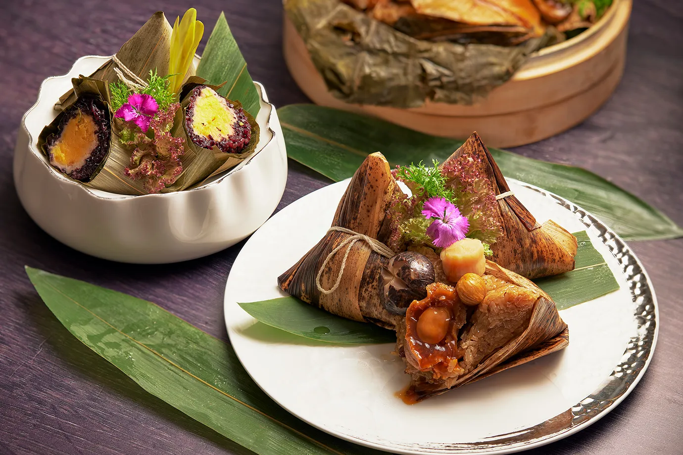 「帝王魚翅鮑魚粽」嚴選鮑魚、干貝與五花肉展現奢華口感。 「貴妃玉容奶皇粽」結合紫米、大甲芋頭與奶皇餡,呈現層次分明且溫潤的甜點風味。