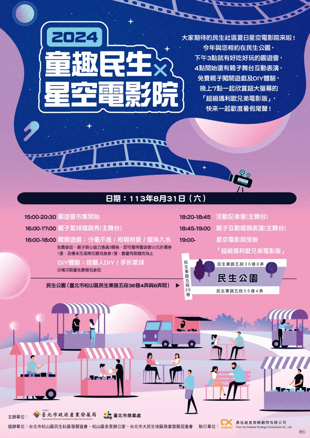 炎炎夏日的午後時光,在都市叢林中最適合投入大自然的沁涼懷抱,一起來綠覆率最高的民生社區商圈吃喝玩樂看電影吧!在暑假的尾聲,臺北市商業處主辦的「2024童趣民生x星空電影院」活動於8月31日在民生公園歡樂登場,現場有匯集在地人氣店家、美食飲品及文創小物、免費DIY體驗及親子闖關遊戲的園遊會,舞台上還有前YOYO台月亮姐姐及Tako姐姐帶領親子互動唱跳,晚間7點起讓徐徐晚風及夜空星光陪伴您一起觀看親子電影「超級瑪利歐兄弟電影版」,全天候免費玩到底,告別暑假共享悠閑慢活的親子時光!