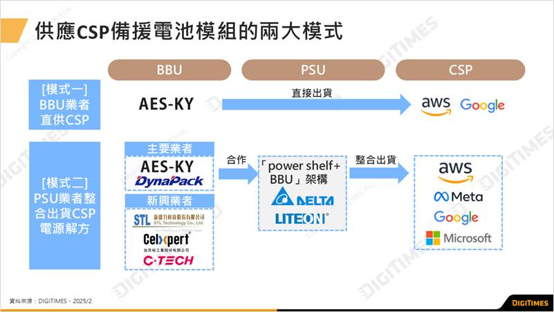 余佩儒觀察,目前台灣BBU業者出貨CSP發展出兩種供應模式,一是BBU業者直接出貨給美系CSP,目前僅AES-KY採用該模式;二是台達電與光寶兩大電源供應器業者,整合BBU,並採用「Power Shelf + BBU」架構供應CSP,為市場主流供應鏈模式。