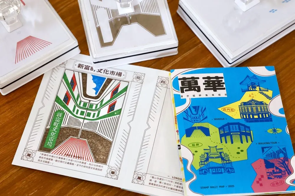 「漫步艋舺」集章摺頁|艋舺龍山寺、西門紅樓、西本願寺等6處景點地標化為四色套章放置於指定之商圈店家中,讓民眾可一步一腳「印」留下美好紀念。