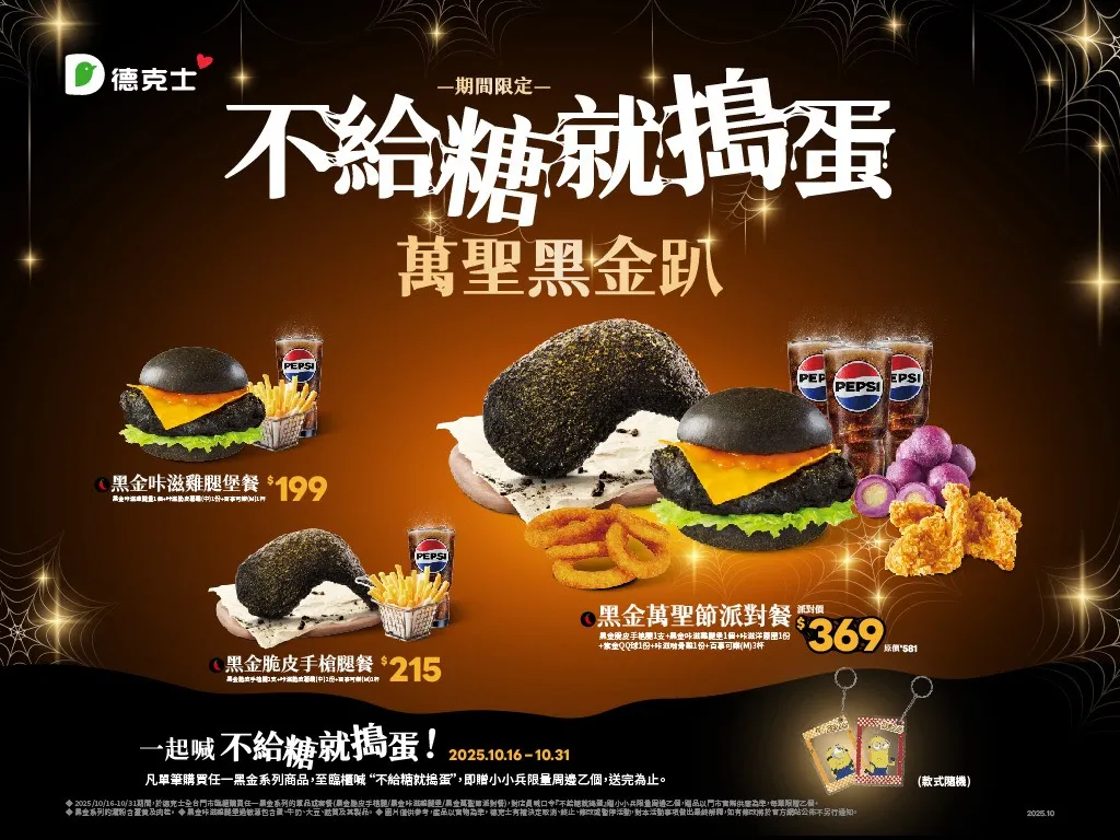 德克士《不給糖就搗蛋・萬聖黑金趴》萬聖節主題活動及期間限定餐點自 2025年10月16日開跑至10月31日止,全台德克士門市同步登場。今年更結合現場互動趣味,凡購買萬聖節限定任一黑金系列商品,臨櫃結帳時大喊「不給糖就搗蛋」,即可獲得限量聯名小小兵周邊乙個(款式隨機,送完為止),讓節慶氛圍更加分。