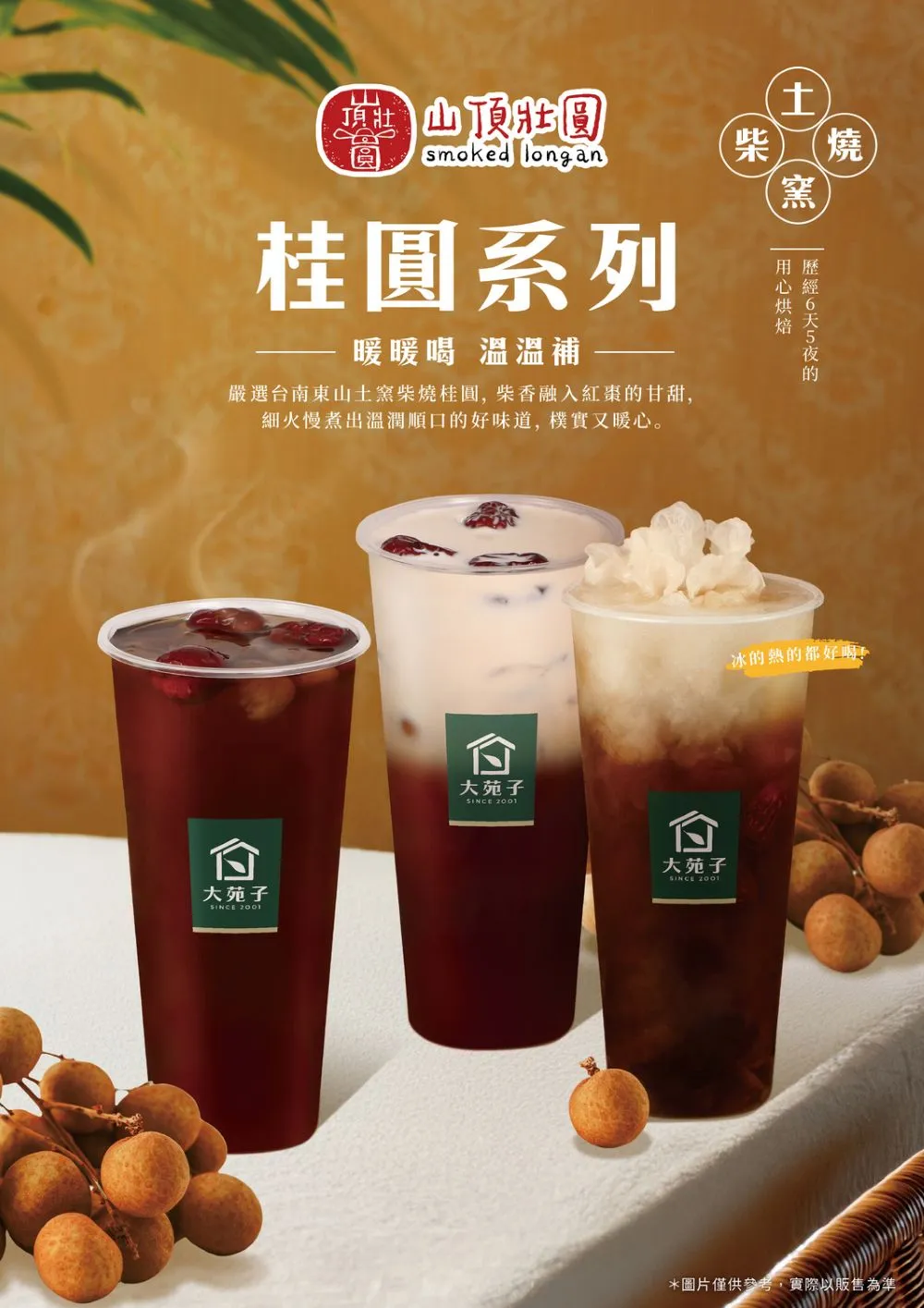 冬日來臨,大苑子11月起推出限定 「桂圓系列飲品」,以台南東山山頂壯圓的在地龍眼為主角,透過傳統土窯柴燒工法慢焙6天5夜,香氣濃郁、甜潤不膩。全新三款飲品「窯燒桂圓紅棗茶、許慶良窯燒桂圓鮮奶茶、窯燒桂圓蜜朵朵」,以手作溫度與在地風味,為這個冬天帶來滿滿暖意!
