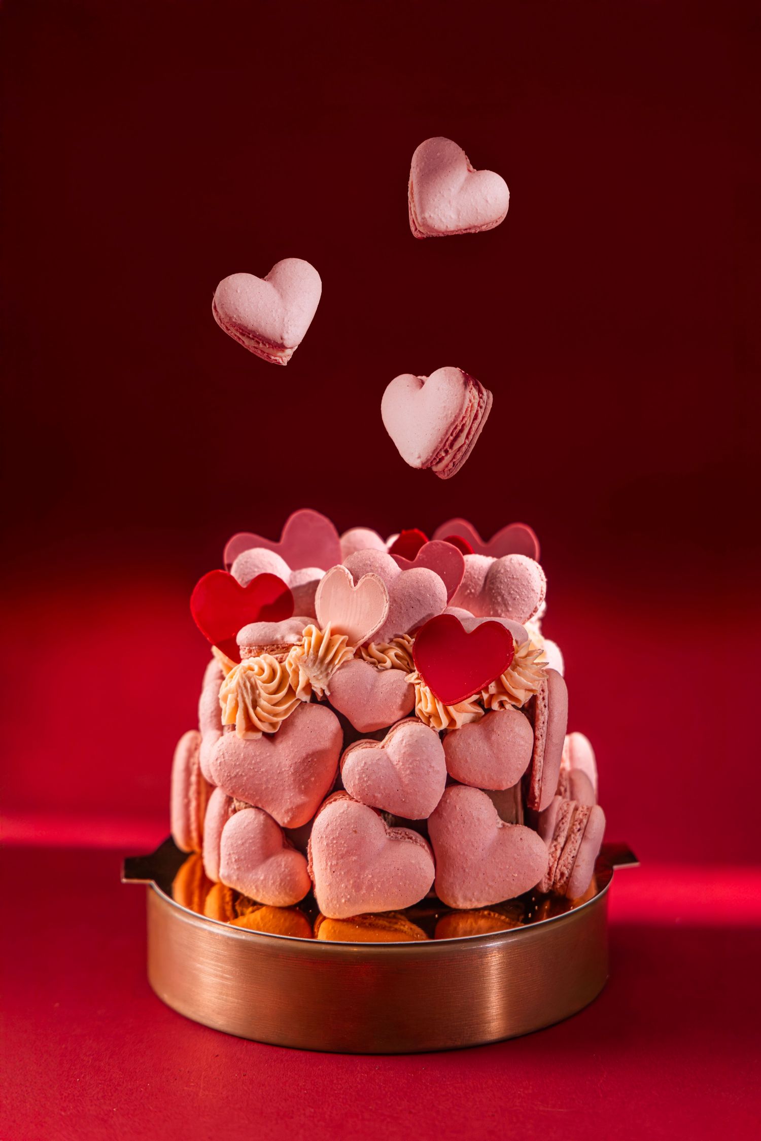 台北君悅酒店為今年西洋情人節獻上「一心一意|800 元/4 吋」心型馬卡龍蛋糕 ,歷經48 小時匠心打造,將怦然心動化為口中甜蜜。