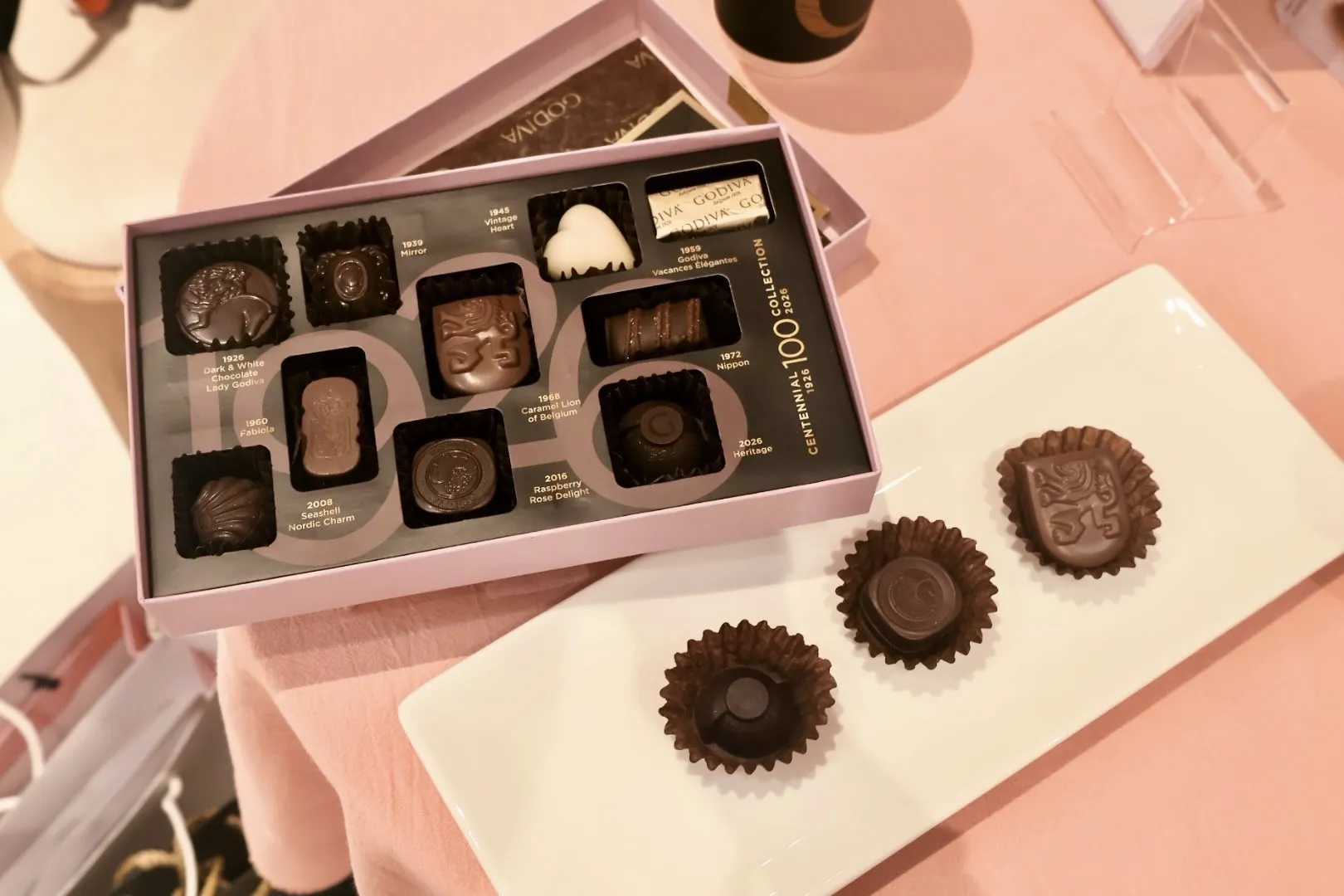 這款百周年限定禮盒一共收錄 10款巧克力,其中9款來自GODIVA不同年代的經典作品,另外1款則是為百年特別打造的「2026開心果杏仁黑巧克力」。從1926年的香草黑巧克力、1939年的蘋果黑巧克力,到2016年的玫瑰味紅莓黑巧克力,每一顆都不只是甜點,也像是一段品牌歷程的縮影!
