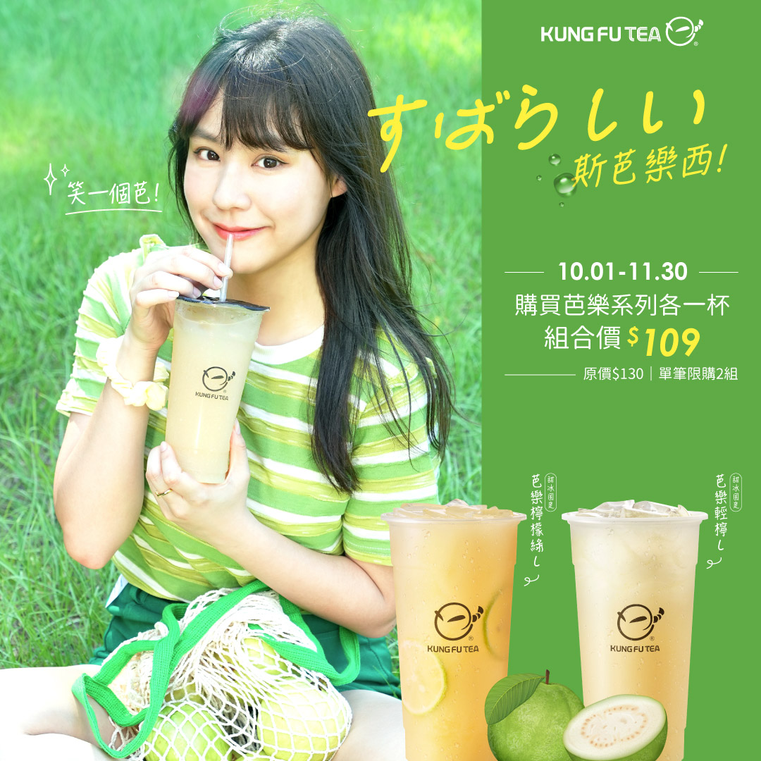 天氣已經沒有夏季那樣炎熱,正適合來杯口感輕盈的飲料,功夫茶推出兩款芭樂系列飲品「芭樂檸檬綠」、「芭樂輕檸」,選用入秋後果核較小,果肉較厚的成熟芭樂做成100%純原汁,甜度高、香氣十足,些微的酸度讓風味更佳順口!10月01日起至11月30日,到功夫茶購買芭樂系列飲品各一杯,即可享有組合價$109,鮮果控不能錯過。