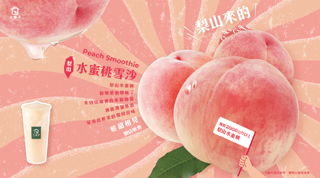 大苑子自10/28起推出「梨山水蜜桃雪沙」,該款飲品使用梨山水蜜桃製作,於全台共40家門市限量上市,每杯雪沙富含滿滿一顆的梨山水蜜桃,細緻雪沙的口感更能感受到梨山水蜜桃的濃郁果香、輕甜氛芳!