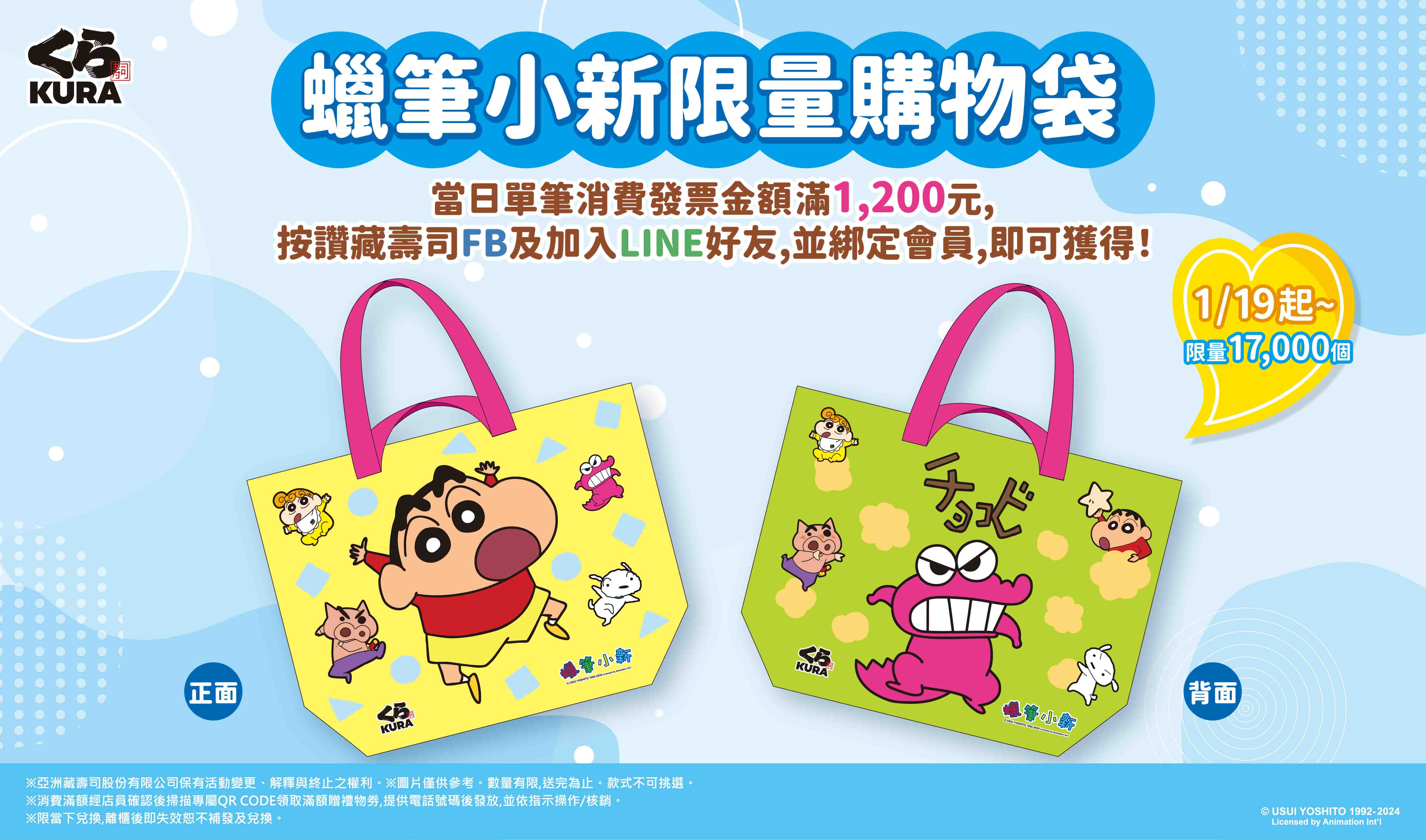 藏壽司再度攜手超人氣角色蠟筆小新,以美食與療癒滿額好禮陪伴大家過冬!1月19日和2月3日兩波超萌聯名滿額贈活動輪番登場,凡於活動期間至藏壽司全台分店消費,當日折扣後單筆消費滿 1,200 元,完成指定任務後至櫃台出示畫面及發票,即可兌換第一波「蠟筆小新限量購物袋」、第二波「蠟筆小新限量疊疊馬克杯」的限量滿額贈禮,每一款都讓人「新」花怒放,超想擁有!